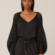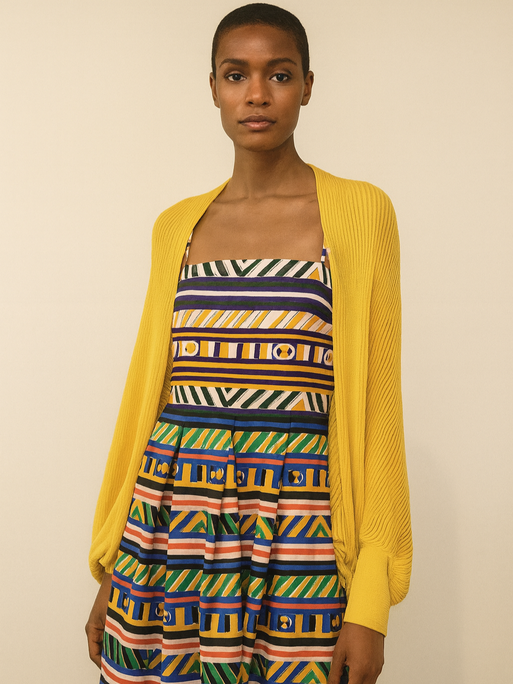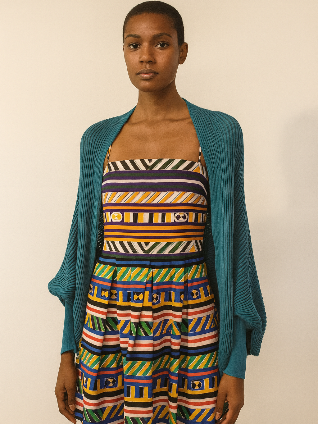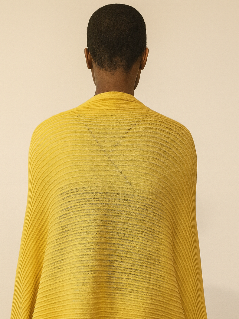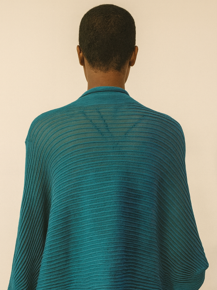 Perforated knit bolero with wide sleeves and cuffs with an elastic knitting. The interchanges of the soft molded shape of the sleeves are an outcome of the horizontal archetypal knitting that make the garment even more attractive.