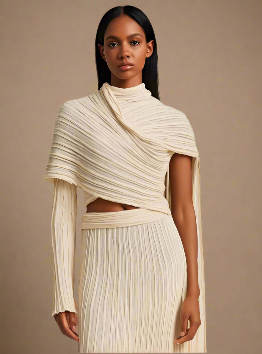 Perforated versatile knit cardigan with asymmetrical panels at the front. Made from 100% Greek cotton, is suitable for all seasons. The thick horizontal archetypal knitting allows for a loose flow and a beautiful fit. A very special piece drawing inspiration from pleats, an eternal motive in art and nature. Can be worn in more than 20 different ways. “Create Yourself” one!