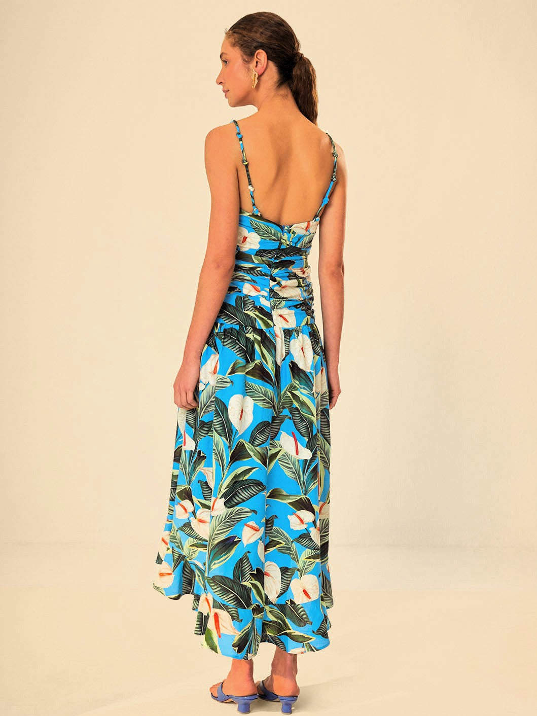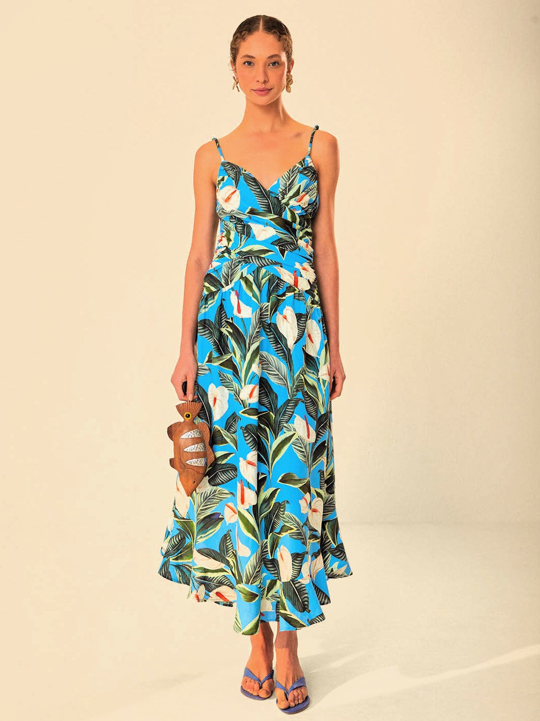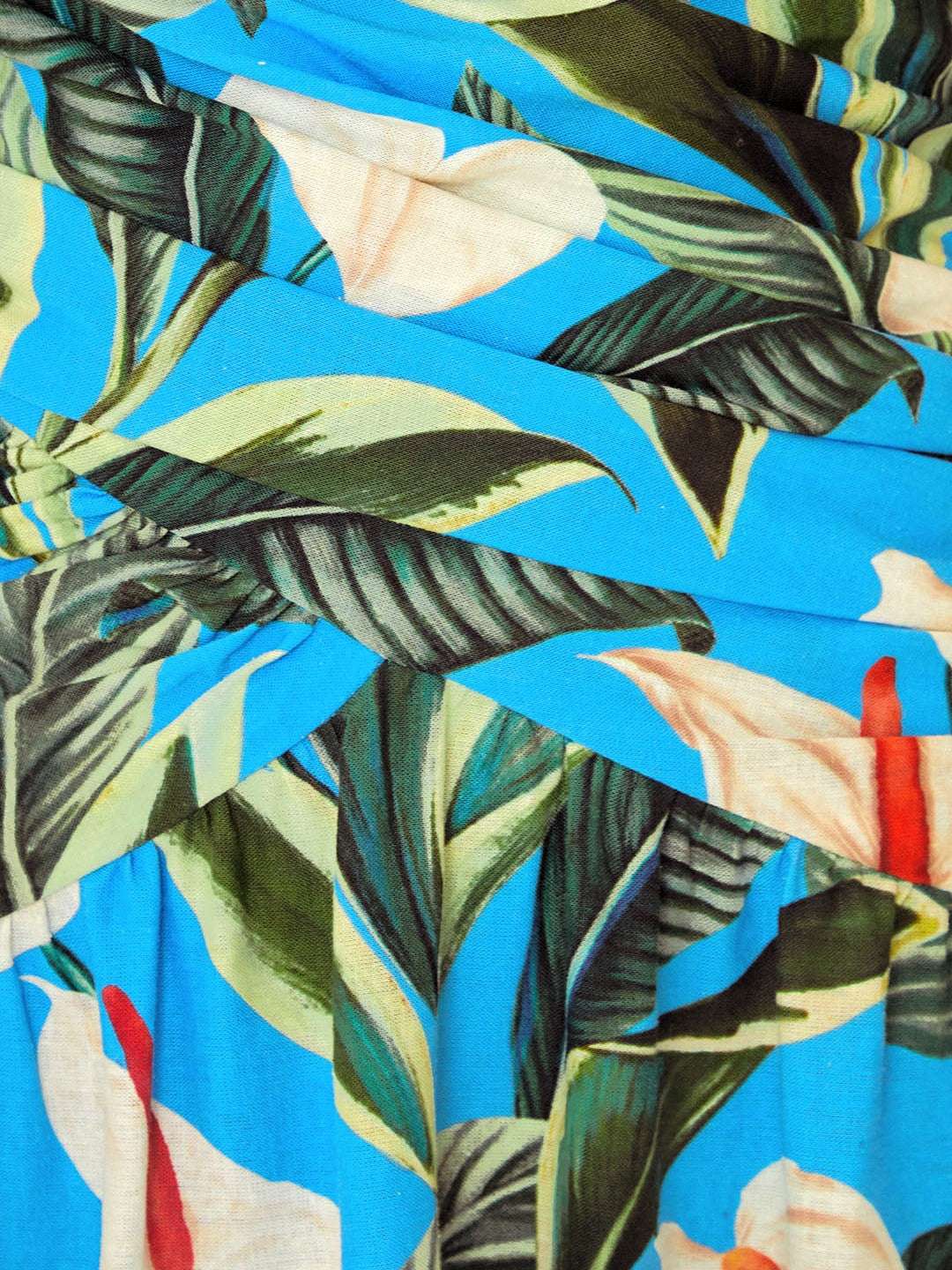 - Print: Bold, botanical anthurium print in ocean blues and lush greens