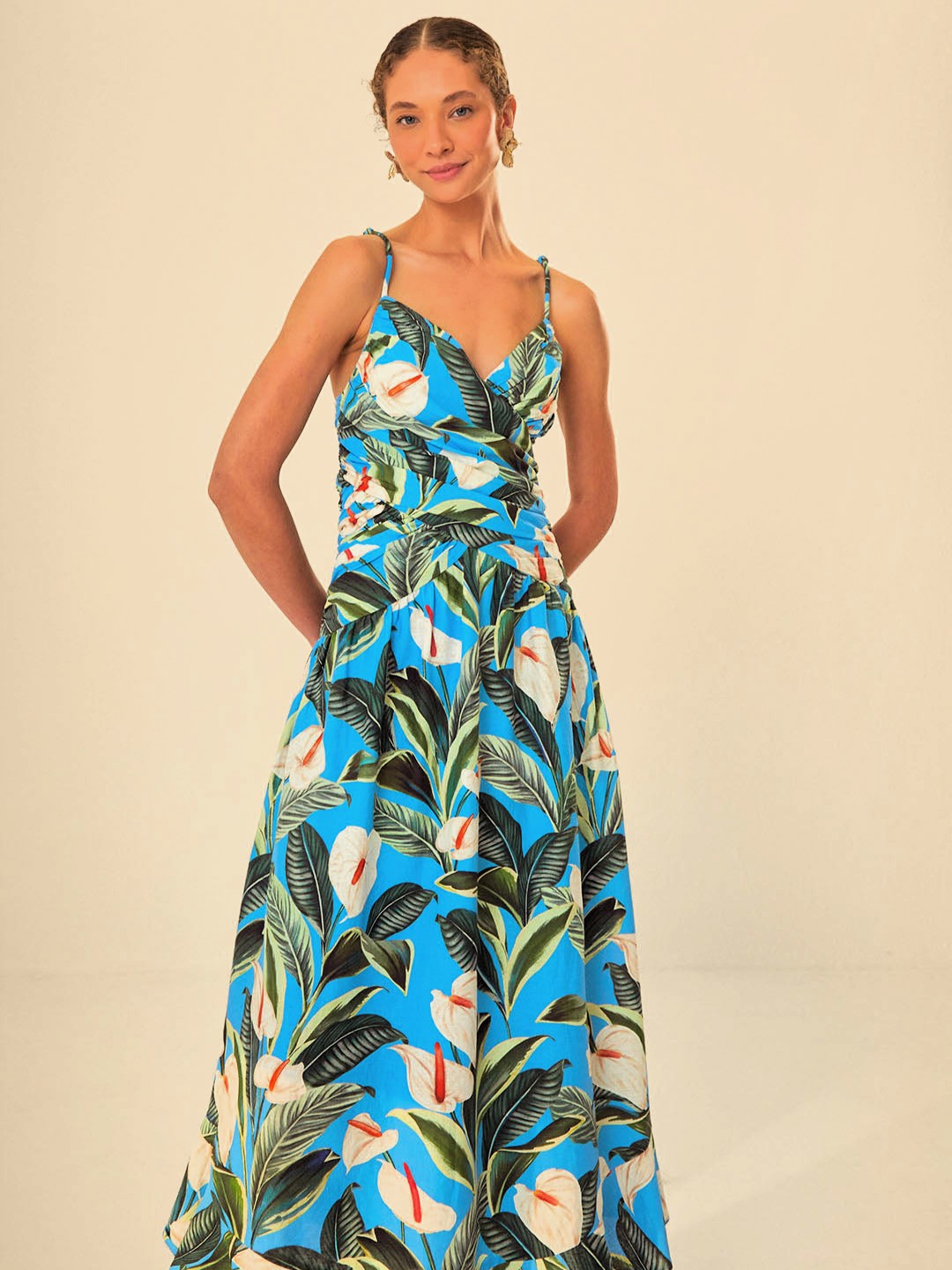 Embrace the vibrant essence of tropical bliss with the Blue Anthurium Garden LENZING™ ECOVERO™ Euroflax™ Maxi Dress. This enchanting piece features a sweetheart neckline that gently highlights your silhouette, while the bold, botanical print dances across the responsibly-made LENZING™ ECOVERO™ and Euroflax™ fabric. The flowing shape and vivacious palette of ocean blues and lush greens invite you to immerse yourself in a world of exotic elegance.