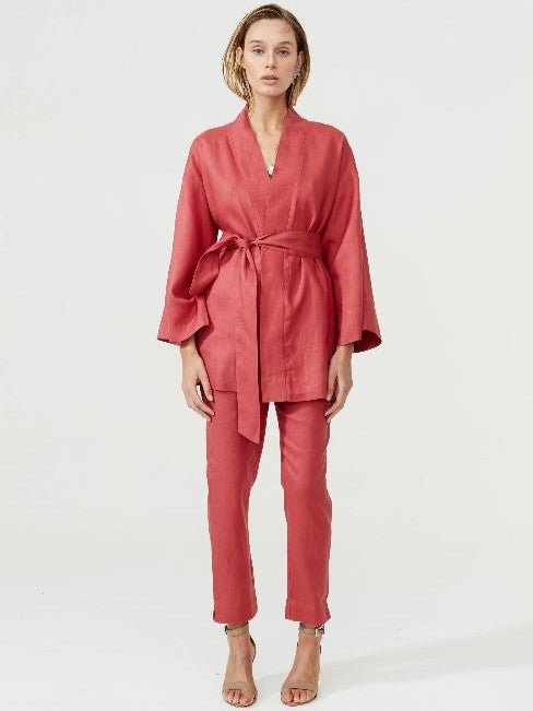 The Kimono Kenia is made from 100% linen and has a self-tie belt to accentuate the waist and secure it closed. The Kimono features straight cut arms allowing space for hand movement. It can be worn open as a cover up or closed to be used as a top.