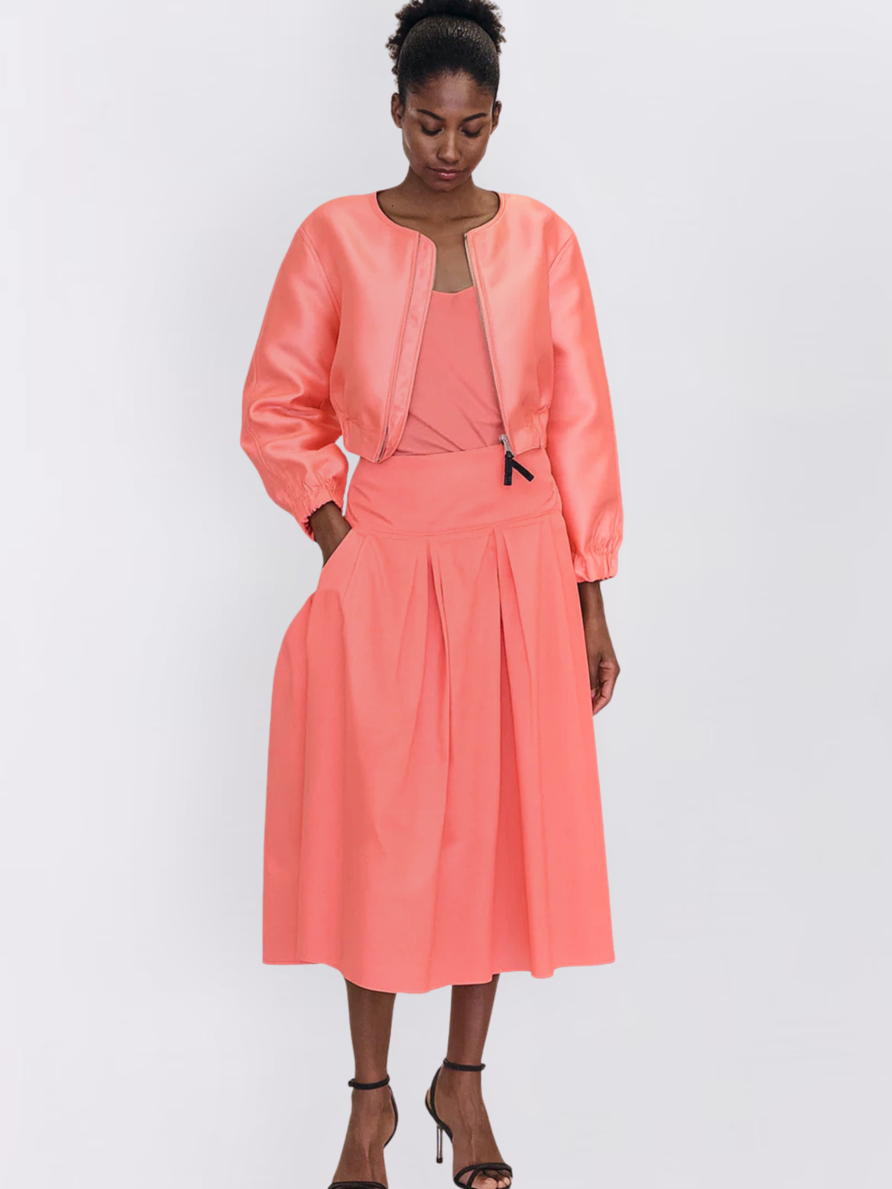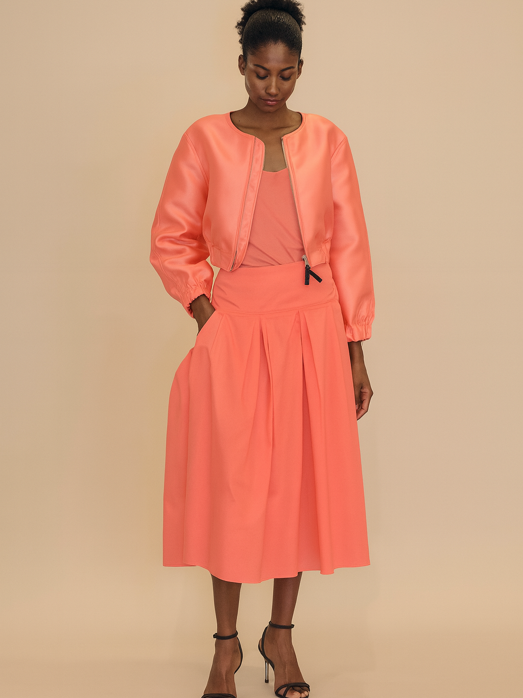 A perfect blend of structure and femininity, this cropped jacket by Susanne Bommer features a gathered waist and sleeves, creating a flattering silhouette. The zip-up front and round collar add a modern, minimalist touch, while the detailed topstitching enhances its refined appeal. Designed for versatile styling, this jacket is a chic layering essential.