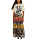 The design features a striking monochrome base layered with vibrant, tropical-inspired motifs in rich tones of orange, pink, yellow, and soft blue. The tiered construction creates volume and fluidity, allowing the skirt to move beautifully with every step.