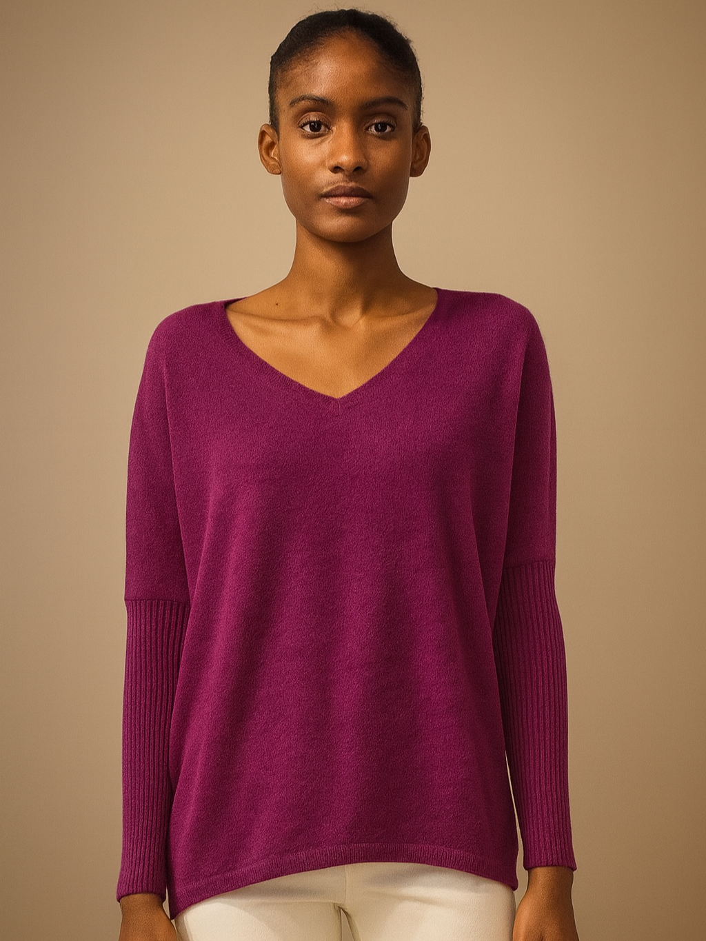 Wrap yourself in luxury with an iconic piece you'll fall in love with. Crafted from 100% cashmere, this jumper features a flattering V-neck and an oversized poncho cut that drapes beautifully on all body types. Ribbed trim and side slits add a modern touch, ensuring comfort and style. The long sleeves provide cozy warmth, making it a versatile addition to your wardrobe that you can wear year-round. Available in a range of stunning colors, this timeless piece is a must-have for any cashmere lover.