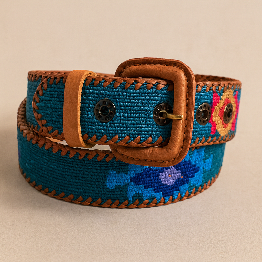 Celebrate heritage and artistry with this exquisite handmade belt, crafted using traditional Guatemalan embroidery techniques. Woven in vibrant silk and backed with supple leather, each piece is a testament to time-honored craftsmanship. The belt is finished with meticulous leather stitching, adding durability and refined detail.