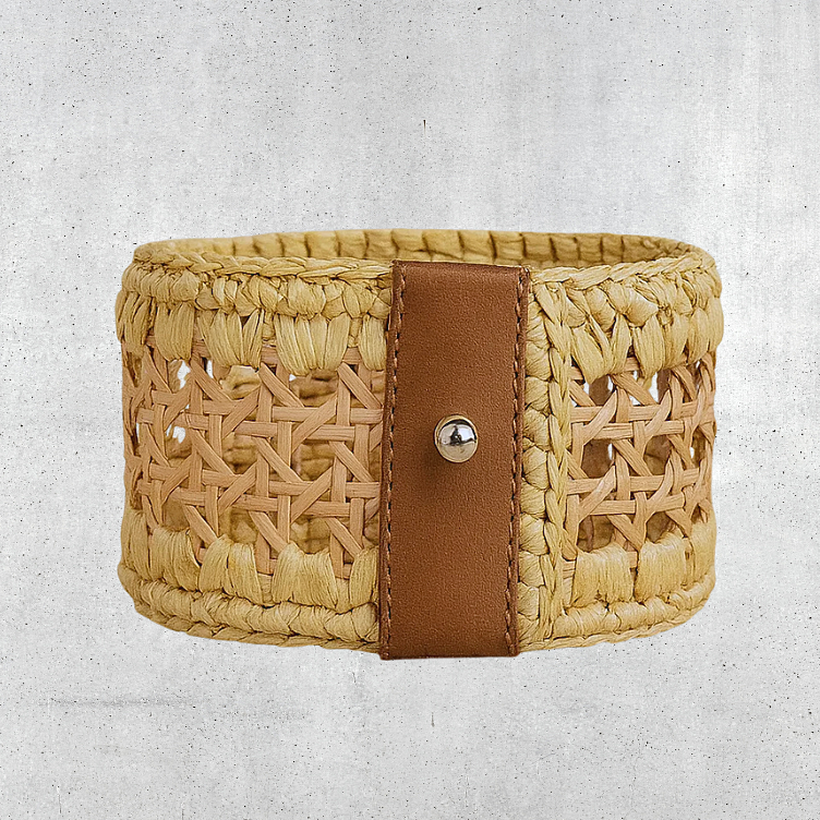 An artisanal accessory combining natural elegance with refined details. Expertly woven from 70% natural fiber and 30% viscose, it is finished with a calf leather trim for durability and polish. The 7 cm width adds a bold touch, while the tie closure ensures an adjustable fit. Made in Italy.