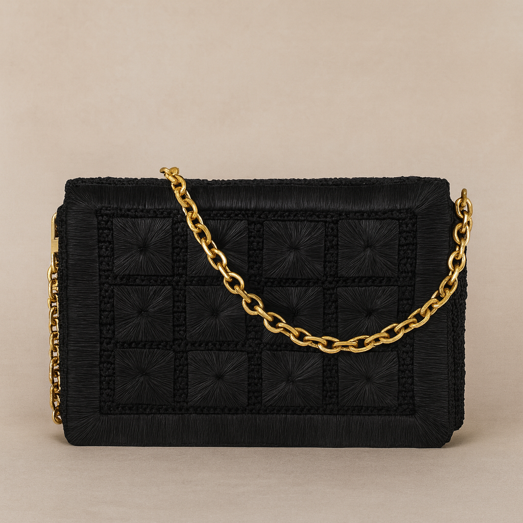 JULIETTE is a beautifully embroidered bag, entirely crocheted and embroidered by hand from raffia fibers and featuring a gold chain in forced mesh. An original and hypnotic raffia bag with its entirely embroidered flap with graphic squares that conceals three inner pockets to slide your precious belongings. Efficient lines, a sophisticated and minimalist look, the JULIETTE raffia bag can be worn as an everyday bag or as an evening version, as a pouch or a shoulder bag. A luxury bag, inspired by the crafty arty style that makes it timeless and so desirable.