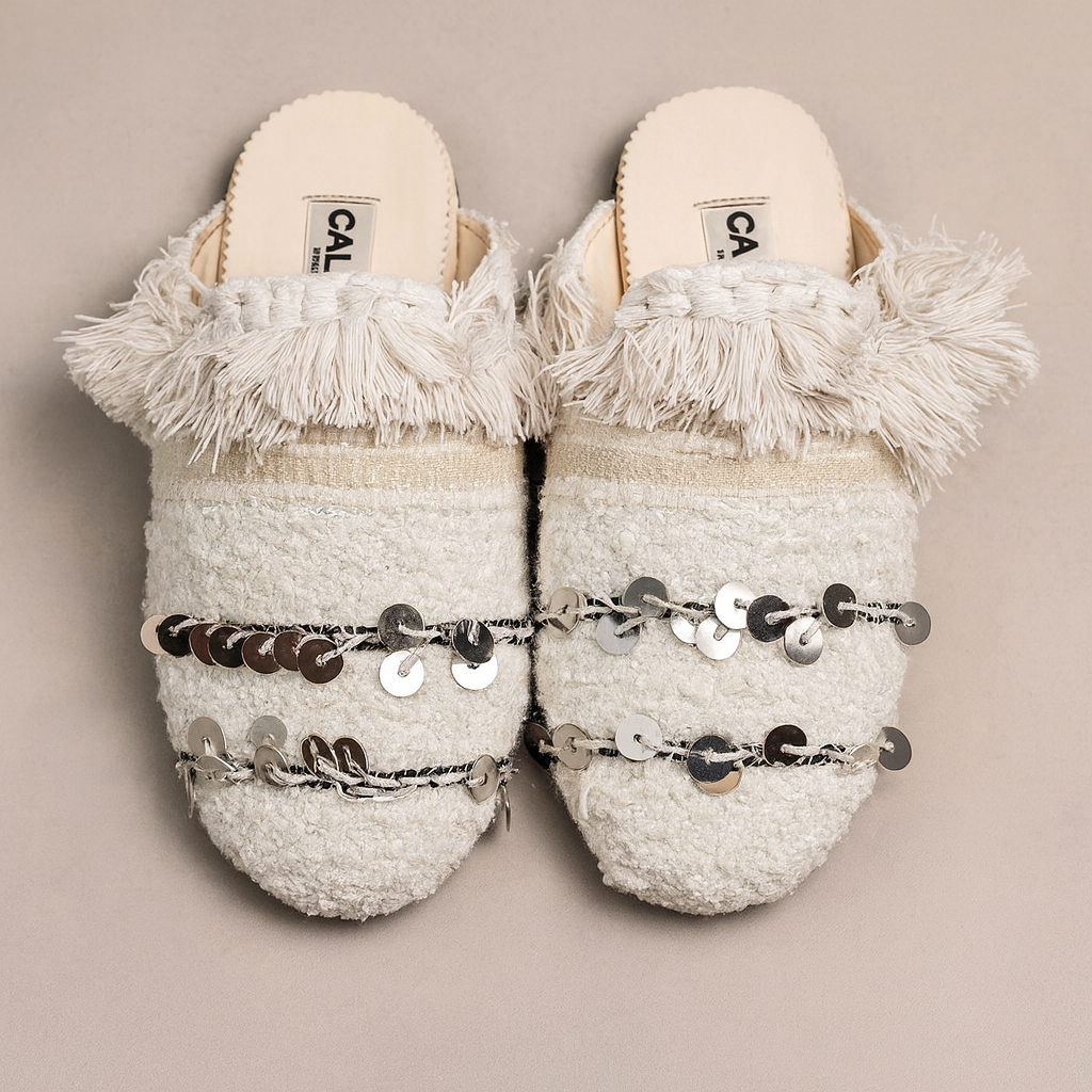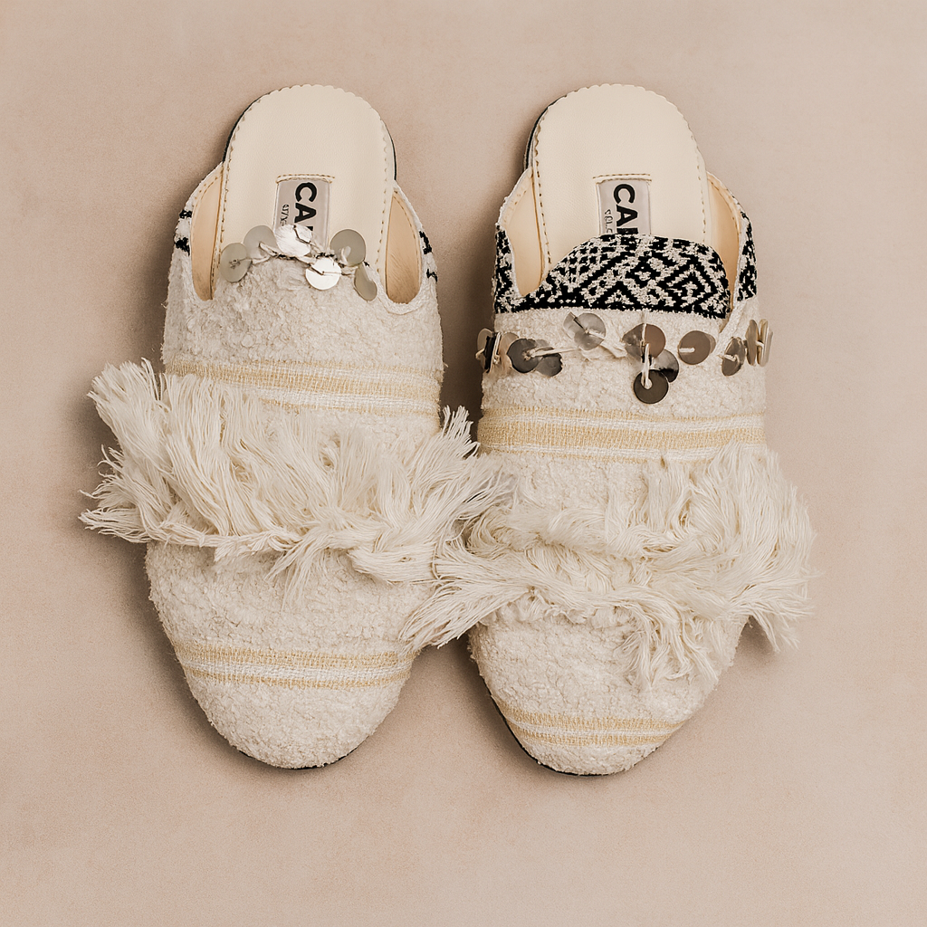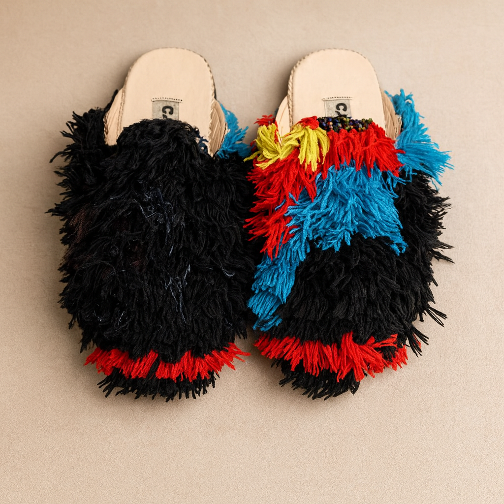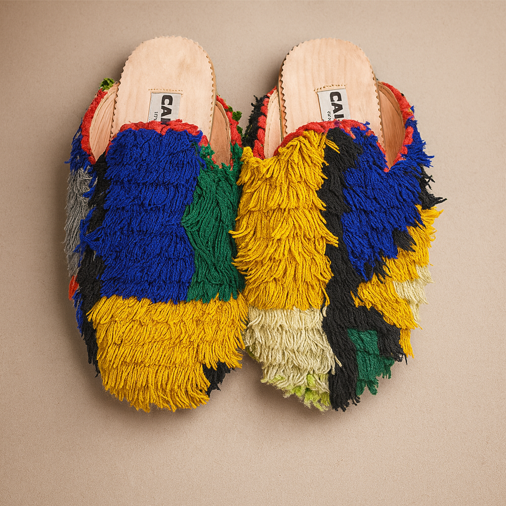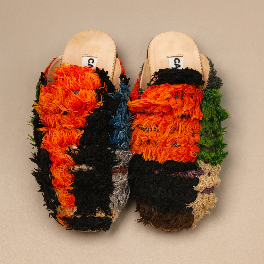 Babuchas hechas a mano a partir de alfombras vintage bereberes. Son de edición limitada ya que salen un número limitado de cada alfombra y cada par es único. Producido por artesanos locales marroquíes en apoyo de sus tradiciones. Estas babuchas son producto de diseño sostenible.