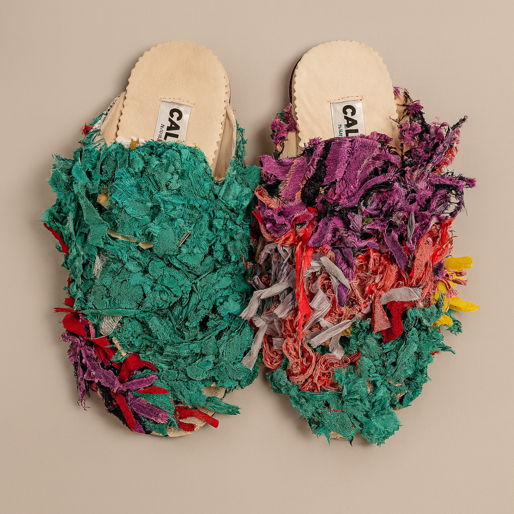 Babouches handmade from upcycled vintage Berber rugs. They are limited edition –as only a handful are made from each rug and each pair is one-of-a-kind. Produced with local Moroccan craftspeople and supporting their traditions. These slippers are a product of sustainable design.