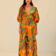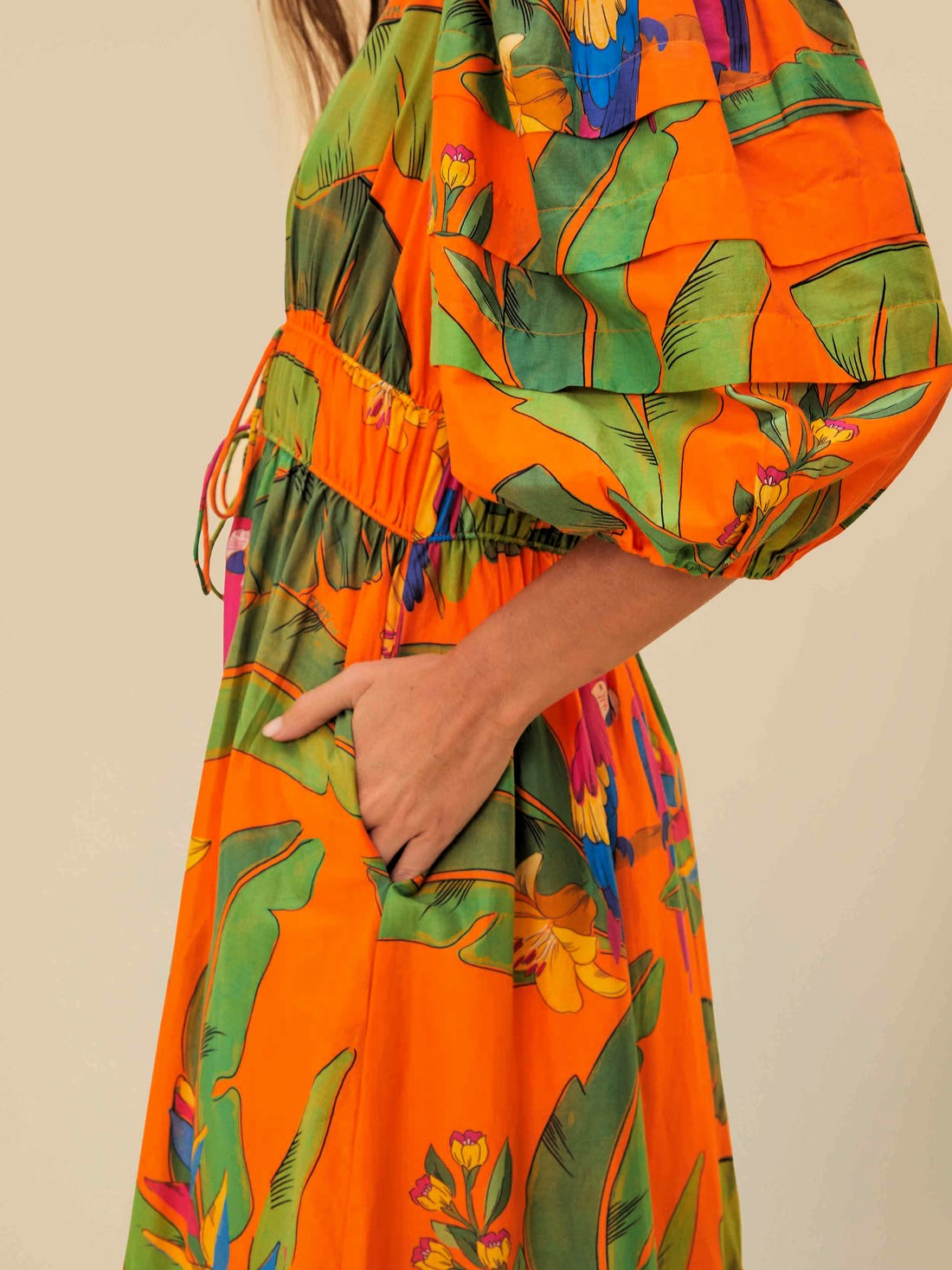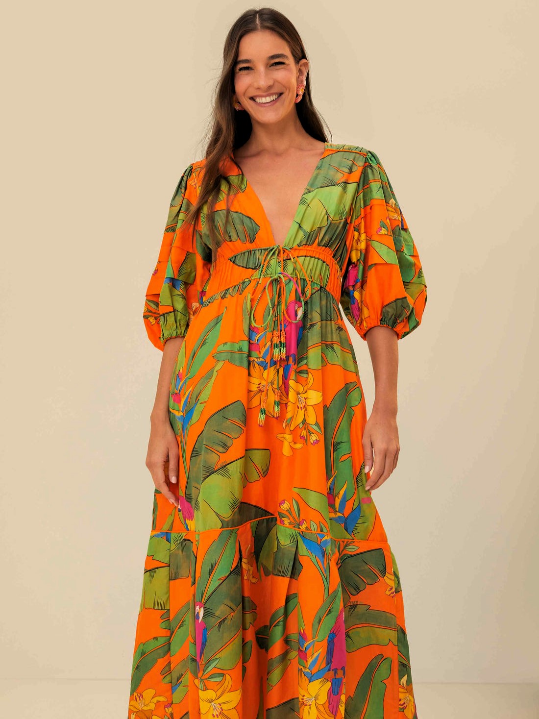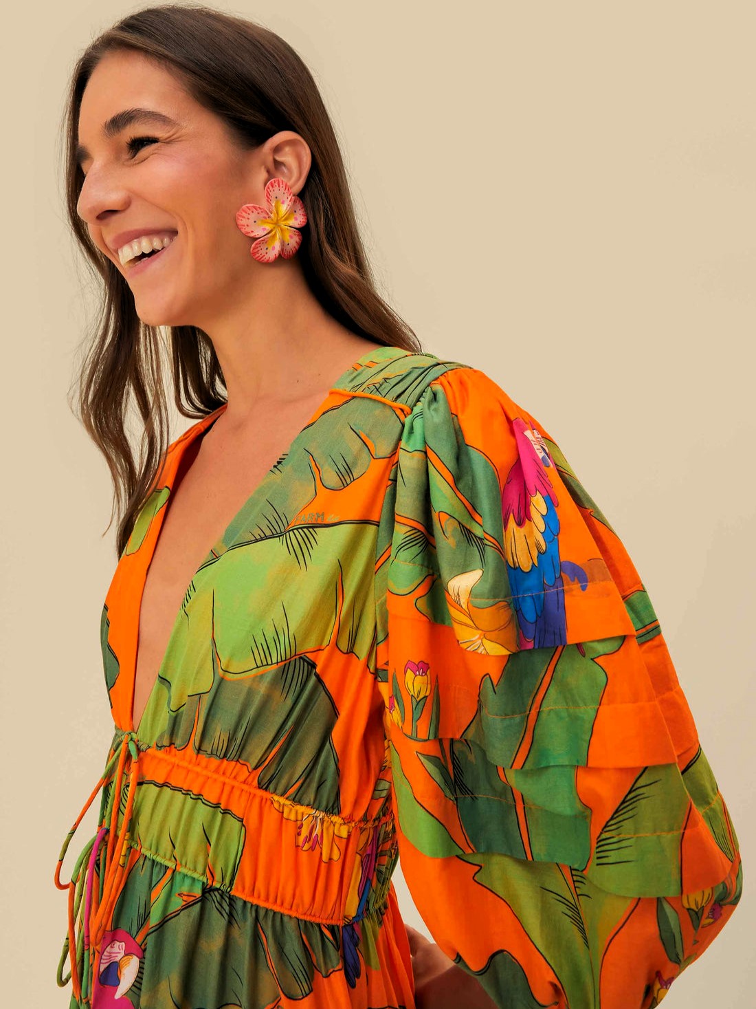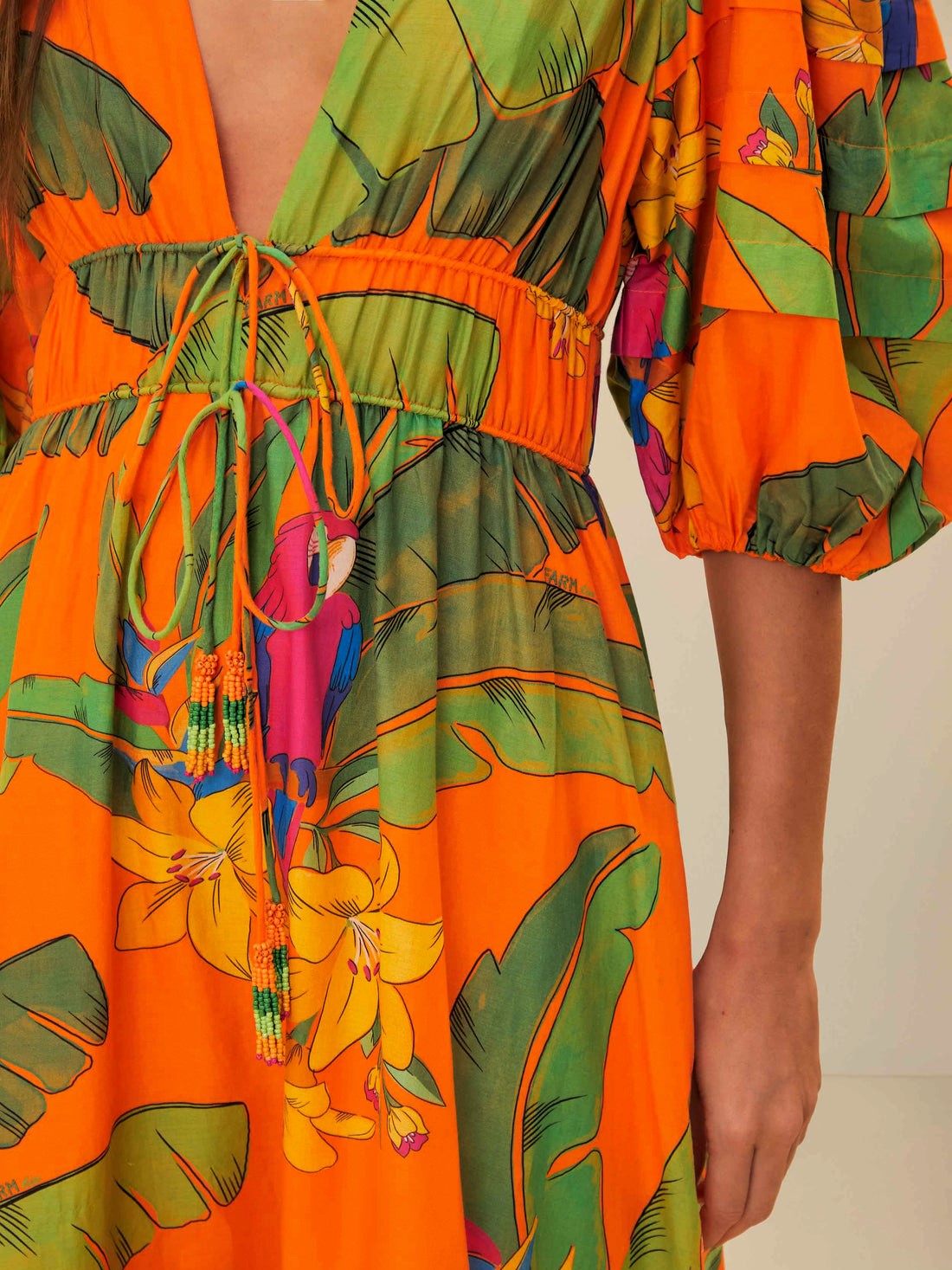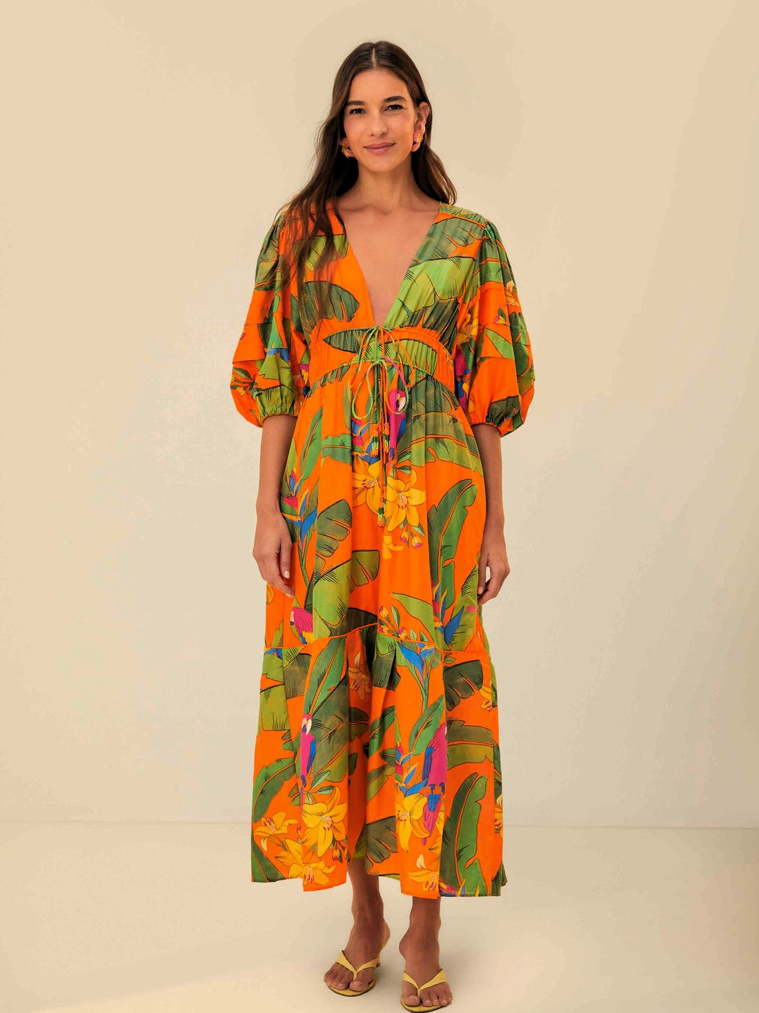 Embrace the essence of tropical splendor with the Orange Fresh Macaws Midi Dress. This stunning garment is a symphony of vivid oranges and greens, featuring a unique macaw and foliage pattern that dances across the fabric, creating an eye-catching display. The softly draped puff sleeves and cinched waist lead to a gracefully flowing midi skirt, perfectly complemented by a flattering V neckline. The playful tassel tie adds a whimsical touch, making this dress ideal for both casual outings and special occasions.