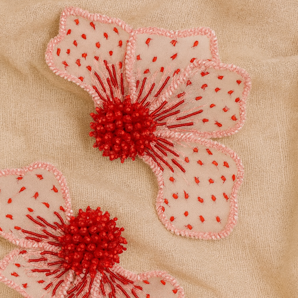 Embroidery on silk organza. The Peony earrings are a celebration of delicate blooms, where the play of transparency harmonizes with elegance. Handcrafted with crystals and glass beads.