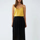 Add an effortlessly chic piece to your wardrobe with this Black Small-Pleated Midi Skirt. Designed with a comfortable elastic waistband, it offers a flexible fit while showcasing an elegant, below-the-knee length. The fabric’s delicate, small pleats bring a touch of femininity, enhanced by an extra pleated layer that subtly adds volume and movement to the skirt.