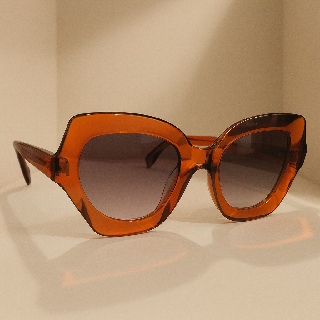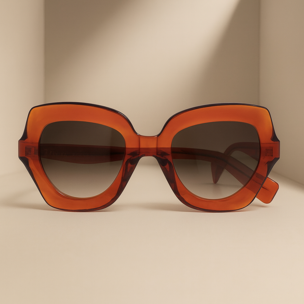 Rita, chunky Geometric front with inverted curved bevels, with a 70’s look mixed with a contemporary feel and a nice oversized fit.