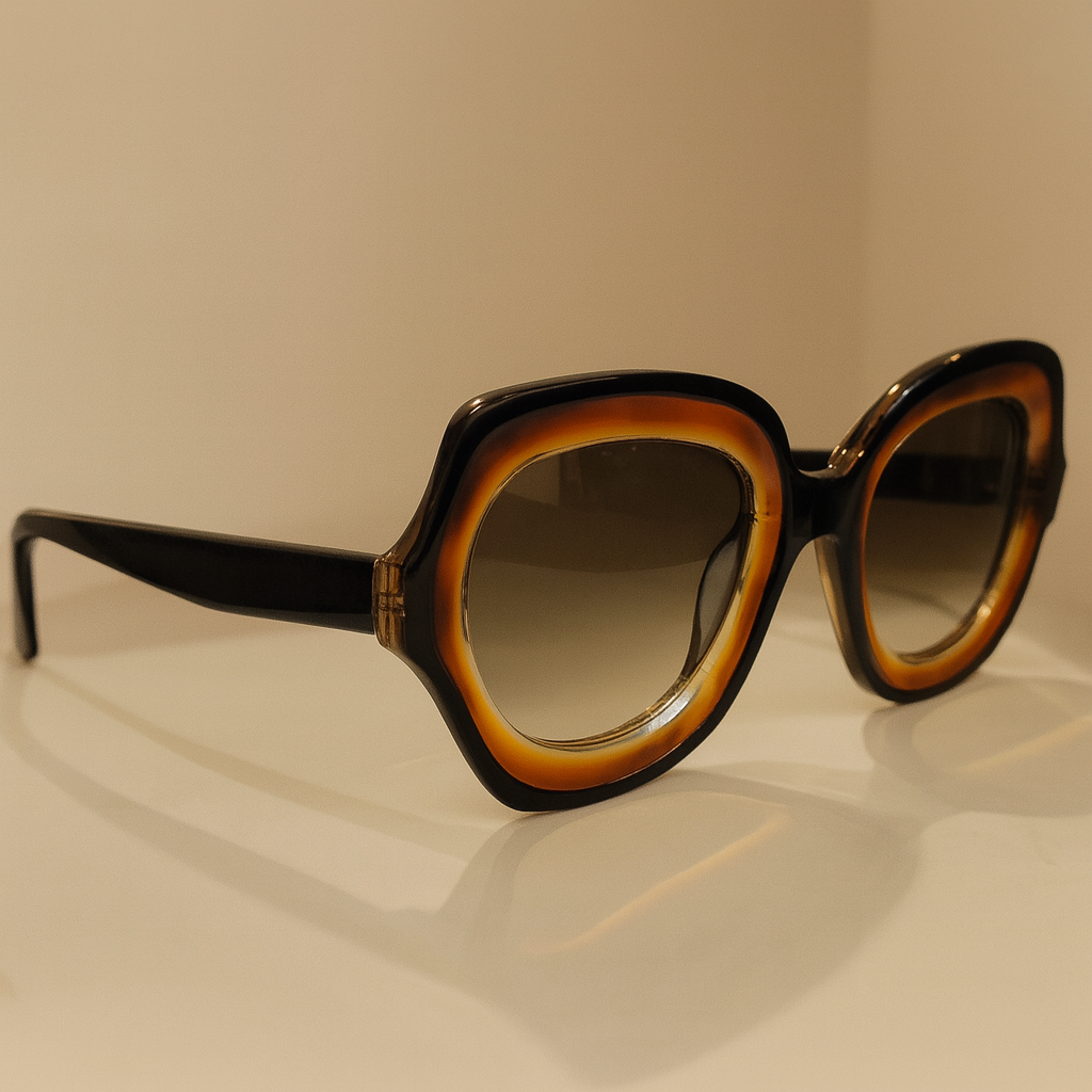 Rita, chunky Geometric front with inverted curved bevels, with a 70’s look mixed with a contemporary feel and a nice oversized fit.