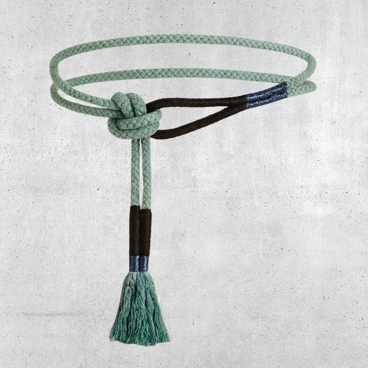 The Rope belt closes with ties that you pass through its buckle before tying them. It is made of cotton cord and highlighted with lurex thread finishes.