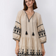 3 tiers short dress combining timeless elegance of Taupe Linen with intricate Brown Hand embroidered details, offering versatility and sophistication for various occasions. A standout piece in any wardrobe.