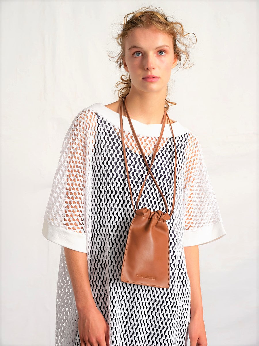 Pouch made of 100% genuine leather. It has leather drawstring straps and can be worn around the neck. It is perfect for carrying around necessary objects without requiring the use of a purse and functions as a stylish accessory.