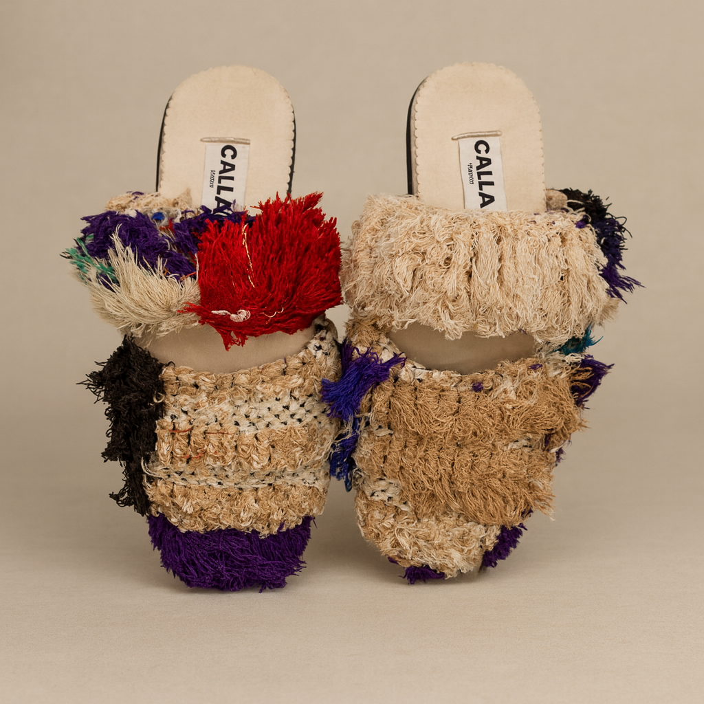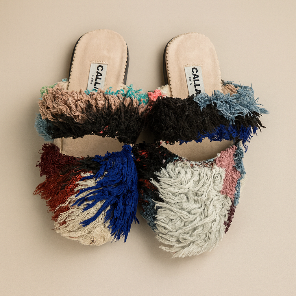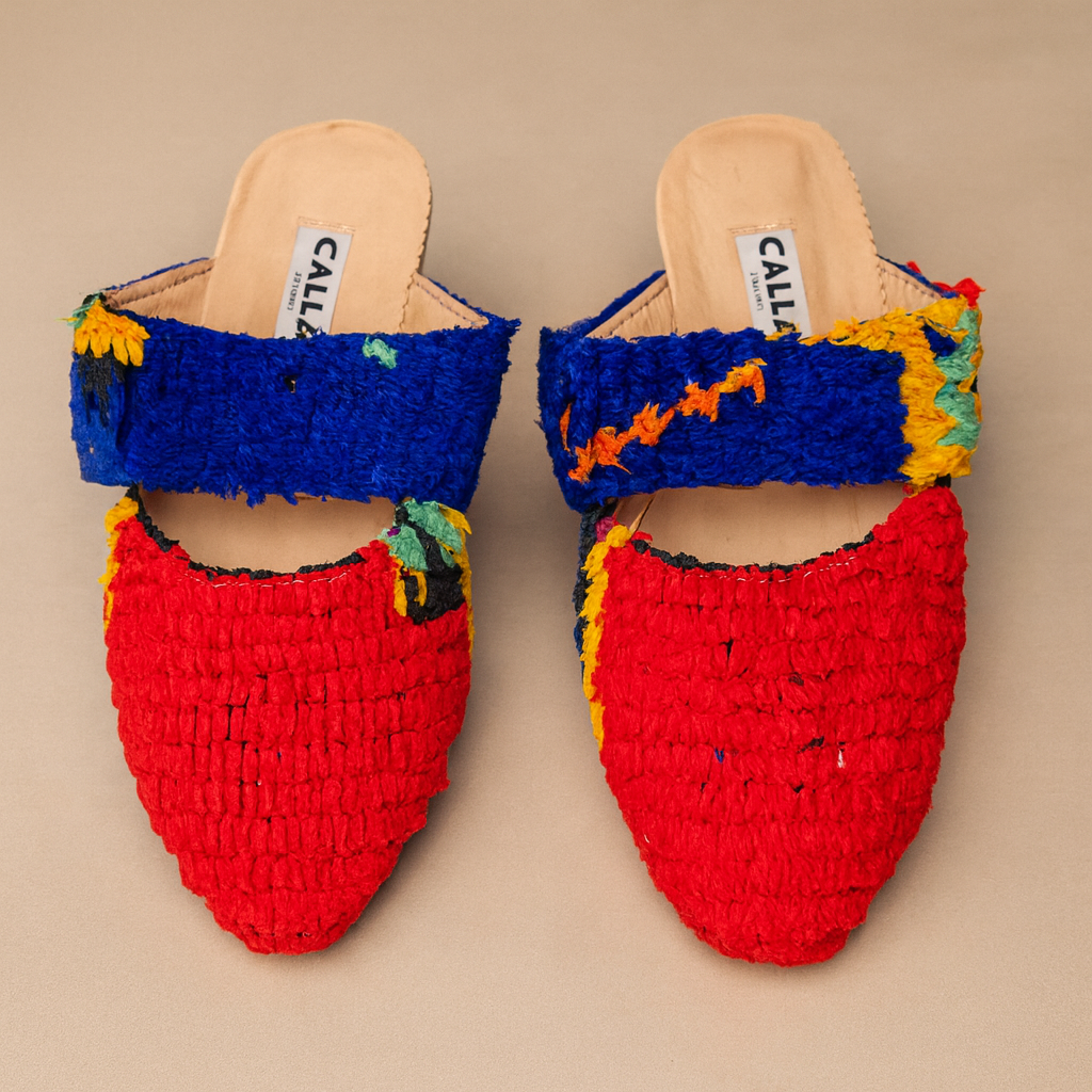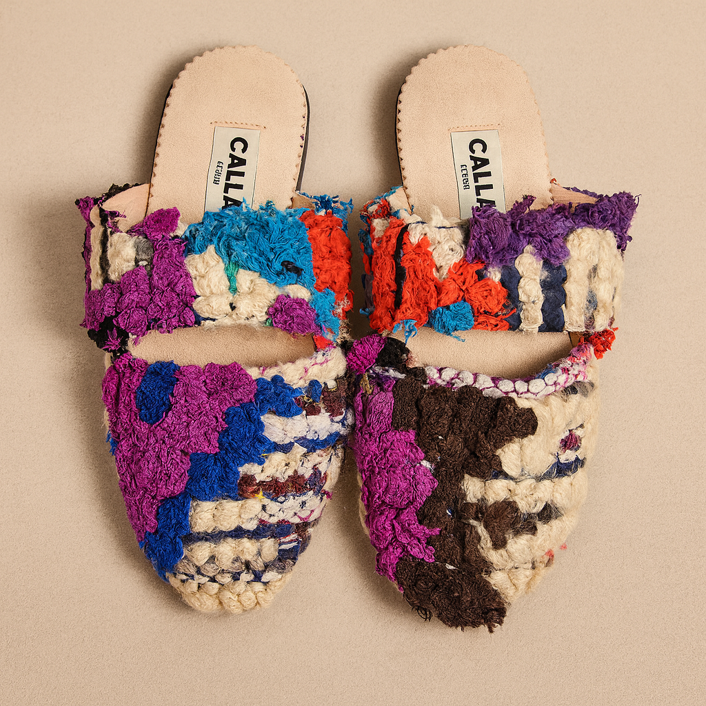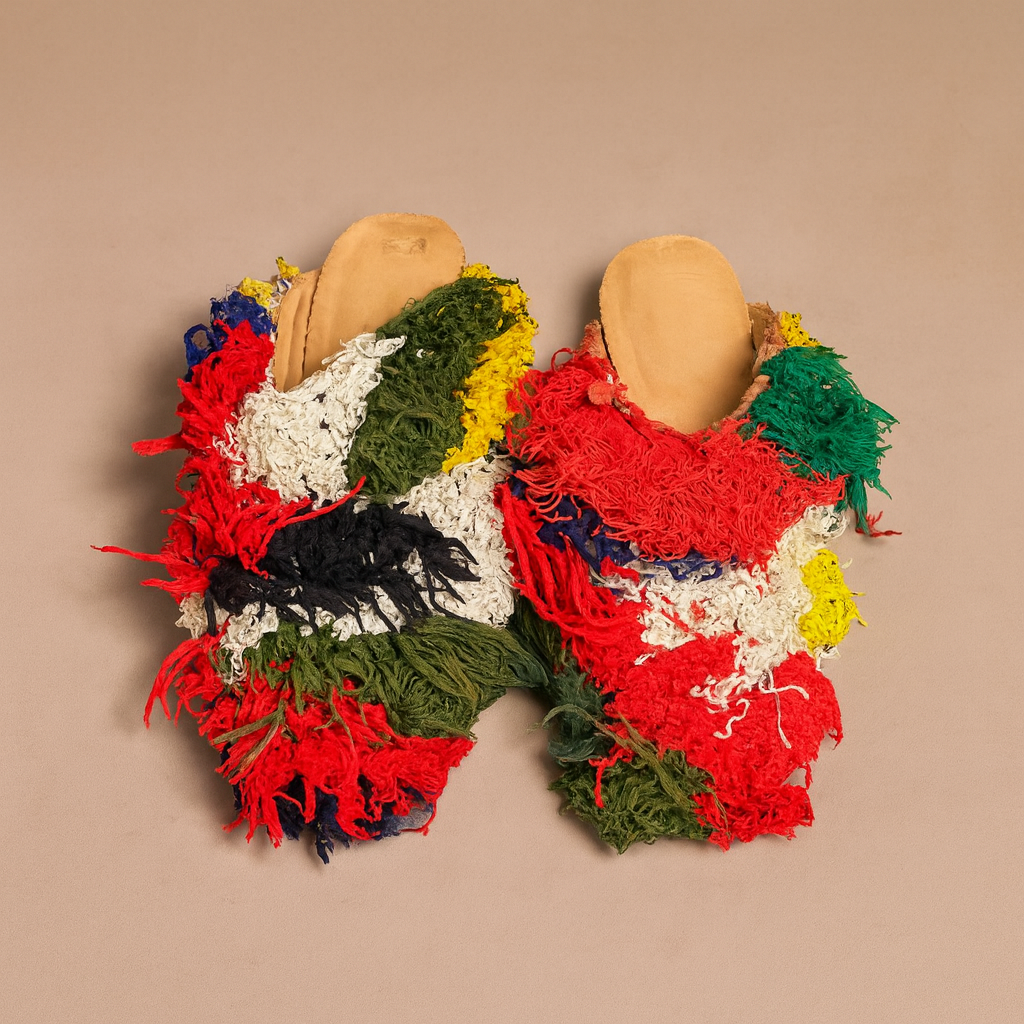 Babouches handmade from upcycled vintage Berber rugs. They are limited edition –as only a handful are made from each rug and each pair is one-of-a-kind. Produced with local Moroccan craftspeople and supporting their traditions. These slippers are a product of sustainable design.