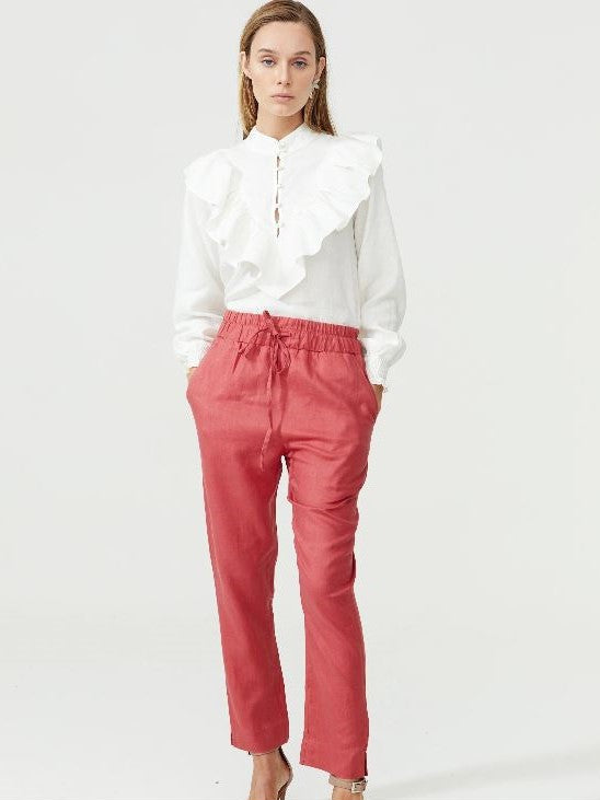 Crafted from 100% organic linen, these trousers are designed for effortless comfort and timeless style. The elastic drawstring waistband and side pockets make them both practical and easy to wear, while the fabric has been pre-washed and softened for a relaxed, lived-in feel.
