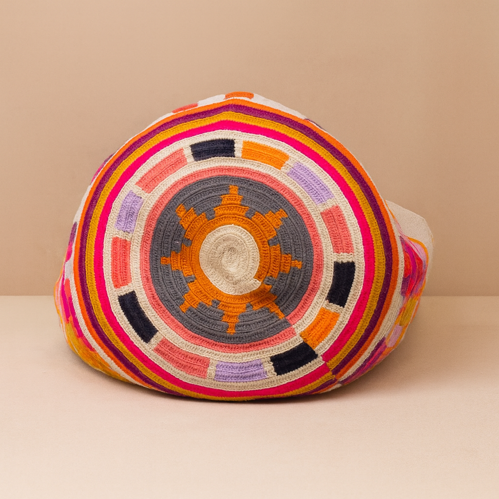 Classic tote bag reinvented adding a boho-chic touch to it with their geometrical and vibrant patterns. Designed in Madrid and hand-crocheted by Wayuu artisans in Colombia. This model is woven with a looser stitch in order to make it lighter and easy to wear on the shoulder with its short handle.