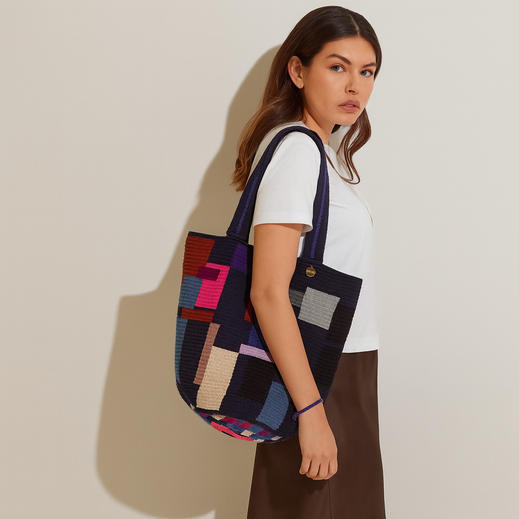 Classic tote bag reinvented adding a boho-chic touch to it with their geometrical and vibrant patterns. Designed in Madrid and hand-crocheted by Wayuu artisans in Colombia. This model is woven with a looser stitch in order to make it lighter and easy to wear on the shoulder with its short handle. Finished with a bronze tag with the mantra BE POSITIVE. Our advice: its size and shape are perfect for uni or work, but you can also wear it to the beach or a trip. The base of the bag may not be the same as the one shown in the photo. The artisans weave the bases using their own designs, so each base is unique and works as their personal trademark.